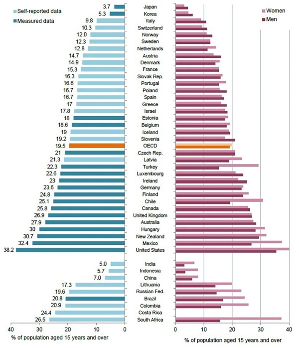 Le graphique présente les taux d’obésité (IMC>30kg.m-2). La moyenne des pays de l’OCDE est de 19,5% d’obèses. Les Etats-Unis, le Mexique, la Nouvelle Zélande et la Hongrie sont les pays les plus touchés avec respectivement 38,2, 32, 4, 30,7 et 30% d’obèses. Le Japon, la Corée, l’Italie et la Suisse sont les pays les moins touchés avec 3,7, 5,3, 9,8 et 10,3% d’obèses. La France est à 15,3% de taux d’obésité (donnée OCDE basée sur du déclaratif légèrement inférieure aux résultats d’ESTEBAN, basé sur des mesures) / Source: Centre de recherche et d’information nutritionnelles (Cerin)