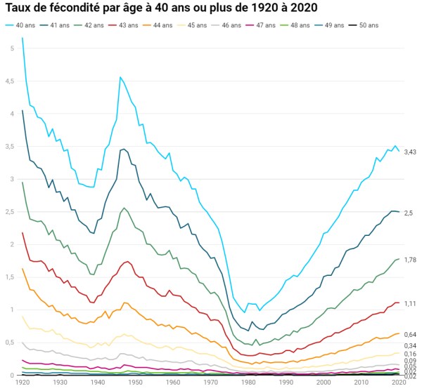 Graphique: Taux de fécondité par âge à 40 ans ou plus de 1920 à 2020 / Source: INSEE
